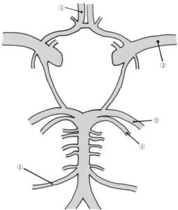 脳底における脳の動脈枝の模式図を示す。主な支配領域が側頭葉外側底面である動脈はどれか。