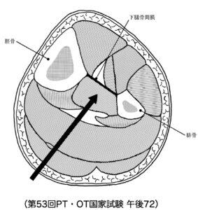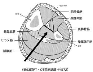 問題8 下腿中央の横断面を図に示す。矢印の筋はどれか。