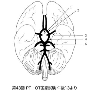 問題5 ウィリス動脈輪の図を示す。後交通動脈はどれか。